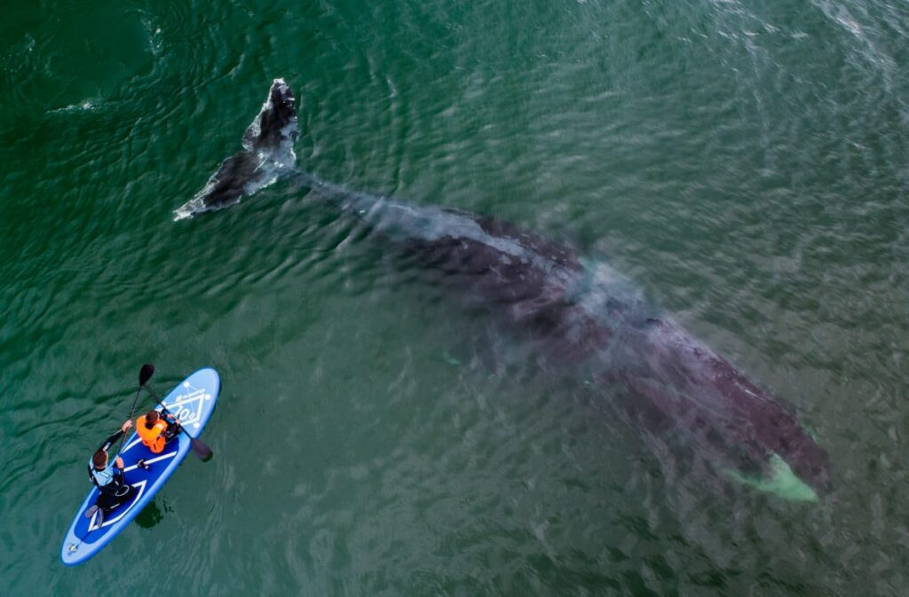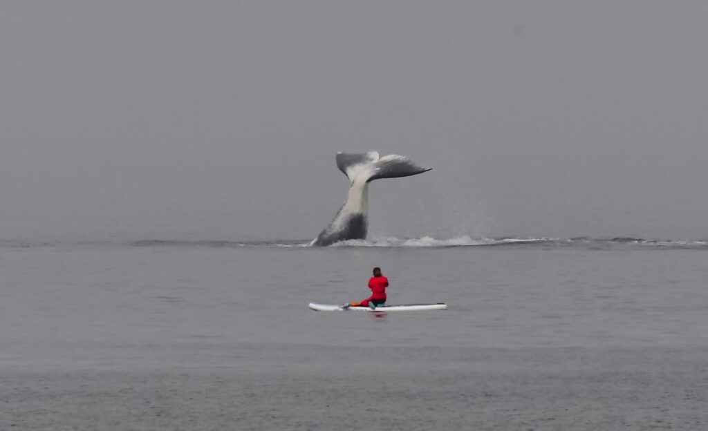 ⠀⠀⠀Поэтому нам удалось увидеть китов на расстоянии. Обычно они подплывают вплотную или, что еще интереснее, проплывают прямо под твоей доской. Можно спрыгнуть в воду и поплавать с китами. Они не опасны. Иногда в бухту на охоту заходят касатки. Стаю касаток мы тоже видели. Для человека они не опасны. Но сердце в пятки уходит от одного их вида.
