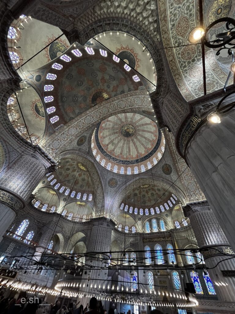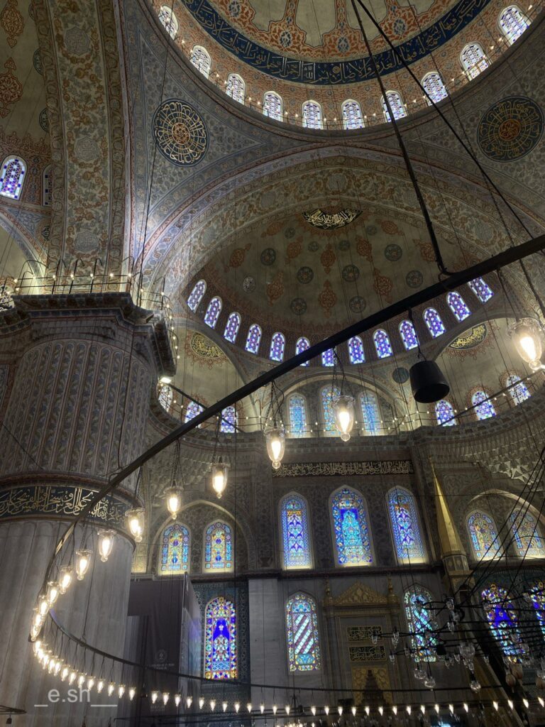 Главное чудо – интерьер: 20 000 белых и голубых изникских плиток с цветочными орнаментами создают эффект небесного свода. Центральный купол высотой 43 м и диаметром 23,5 м кажется невесомым благодаря 26 окнам, а люстра из кованого железа с подвесками в форме страусиных яиц – символ божественного промысла.